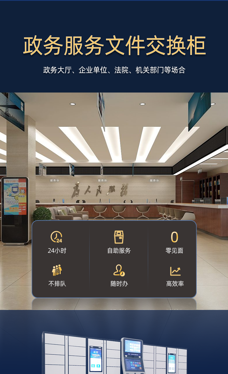 行政審批中心文件交換柜是一種放置于政務大廳、企業單位、法院、機關部門等地方,主要用于老百姓公文自助遞交、企業文件、公文、回執之類的交換辦公使用,用戶將文件放置于柜子后提醒工作人員取走辦理,管理人員辦理完成后將文件重新放回柜子,柜子會給用戶發送信息,提